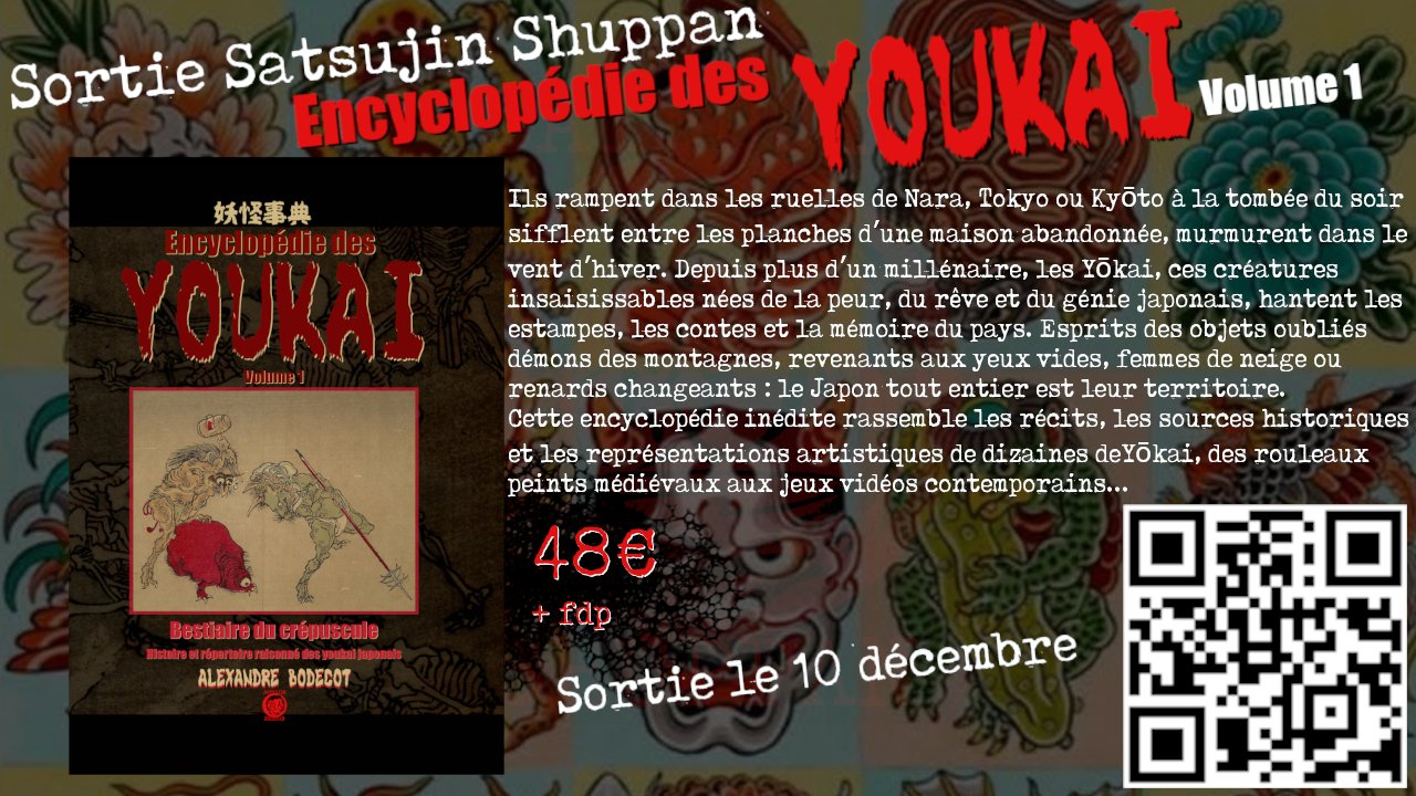 Ils rampent dans les ruelles de Nara, Tokyo ou Kyōto à la tombée du soir, sifflent entre les planches d’une maison abandonnée, murmurent dans le vent d’hiver. Depuis plus d’un millénaire, les Yōkai, ces créatures insaisissables nées de la peur, du rêve et du génie japonais, hantent les estampes, les contes et la mémoire du pays. Esprits des objets oubliés, démons des montagnes, revenants aux yeux vides, femmes de neige ou renards changeants, le Japon tout entier est leur territoire. La première partie de. cette encyclopédie inédite rassemble les récits, les sources historiques et les représentations artistiques de dizaines de Yōkai, des rouleaux peints médiévaux aux jeux vidéos contemporains. Du pinceau de Toriyama Sekien aux planches de Mizuki Shigeru, des villages de Tōno aux sanctuaires perdus de Kyūshū, c’est tout un monde invisible qui se dévoile, un monde où le grotesque côtoie le sublime, où chaque ombre semble respirer. Les précommandes de ce premier volume sont ouvertes, et le livre arrivera dédicacé bien entendu. Le lien de commande direct : https://www.paypal.com/instantcommerce/checkout/8VF2UNT7S98RE